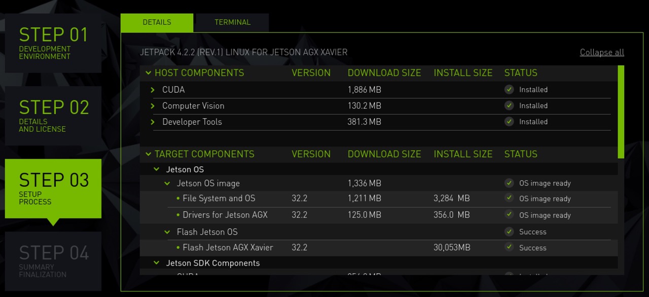 Then we switch back to the SDK Manager window, and click the biggest start button. Waiting for the Flash Jetson OS step finish.
